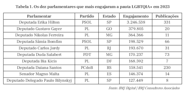 Da somatória total de engajamento, 69,6% de publicações foram feitas por parlamentares que costumam se posicionar favoráveis à causa LGBTQIA+. Essa porcentagem, no entanto, deve considerar que nem todo o engajamento é positivo, logo, proibindo uma inferência direta de que esse valor seja de pessoas a favor da pauta e defendam a discussão de direitos pelo Poder Legislativo. Essa perspectiva pode ser mais bem entendida quando se observado os dez principais parlamentares que mais engajaram na pauta em 2023.